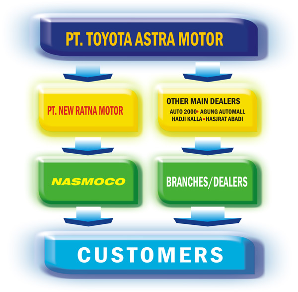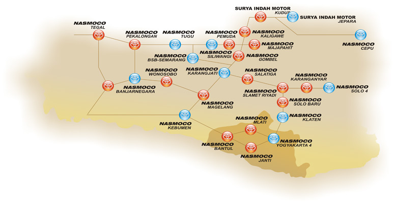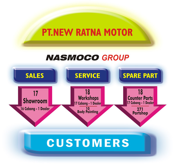PT New Ratna Motor melalui jaringan Nasmoco Group telah memiliki 19 cabang/dealer dengan layanan penjualan unit kendaraan, service dan penyediaan Spare Part (VSP-Vehicle, Service dan Parts) yang tersebar di hampir seluruh kota-kota besar di wilayah Jawa Tengah dan Daerah Istimewa Yogyakarta. Pada beberapa tahun ke depan, kami merencanakan membangun beberapa outlet baru sebagai wujud komitmen pelayanan dan mendekatkan diri dengan customer.